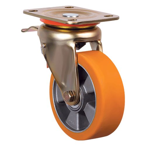 Данная модель оснащена поворотным оцинкованным кронштейном с тормозом, имеет диаметр 125 мм, может выдерживать вес до 350 кг. Может быть установлена на мобильное оборудование, применяемое на складах, строительных, промышленных и торговых площадках.