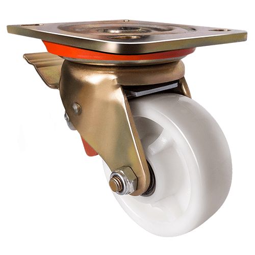 Данное большегрузное нейлоновое колесо предназначено для установки на передвижное оборудование, используемое в пищевой, химической и фармацевтической промышленности. Оно не боится воздействия влаги и различных химически агрессивных веществ, отличается низким коэффициентом трения и высокой износостойкостью. Шариковый подшипник в оси обеспечивает плавное вращение. Поворотный кронштейн изготовлен из оцинкованной стали, тип крепления — платформа с отверстиями под болты. Наличие тормозного механизма позволяет при необходимости надежно блокировать колесо, предотвращая его самопроизвольное перемещение. Максимальная грузоподъемность модели — 750 кг.