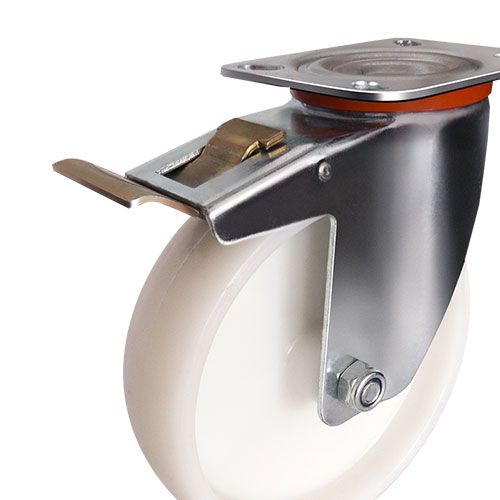 Колесная опора EMES EM01 ZKZ 200 F устанавливается на платформенные тележки для пищевой промышленности, передвижное медицинское оборудование и технику. Нейлоновый обод хорошо распределяет нагрузку. Поворотный кронштейн с тормозом изготовлен из оцинкованной стали. Максимальная грузоподъемность модели составляет 230 кг. Рабочий температурный диапазон — от -20 до +70 °С.