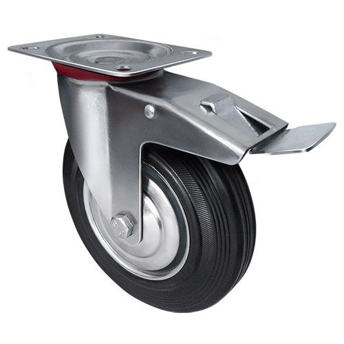 Колесо промышленное поворотное с тормозом SCB42 предназначено для мусорных контейнеров, промышленного оборудования, платформенных тележек, лесов и строительных вышек-тур. Шинка выполнена из литой, черной резины. Колесо имеет стальной оцинкованный обод. В оси установлен роликовый подшипник. Кронштейн с платформенным креплением изготовлен из оцинкованной стали. Отличается средней устойчивостью к воздействию химических веществ. Может передвигаться по грубой поверхности и эксплуатироваться в условиях влажной среды.