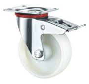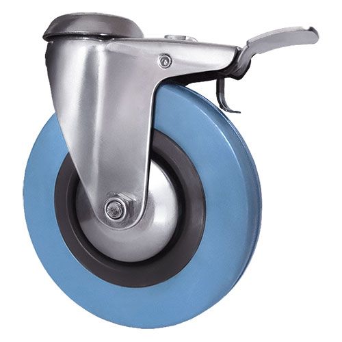 Колесо аппаратное поворотное под болт с тормозом SChgb 25 предназначено для легкого торгового, лабораторного, медицинского, гостиничного, офисного и складского оборудования. Шинка выполнена из термопластичной серой резины. В оси установлен подшипник скольжения. Кронштейн с креплением «под болт» изготовлен из оцинкованной стали. Полипропиленовый обод закрыт стальными кожухами. Не оставляет следов на напольных покрытиях. Отличается хорошими ходовыми качествами, повышенной маневренностью, низким уровнем шума, устойчивостью к внешним химическим воздействиям. Диапазон температур — от -35ºC до +60ºC.