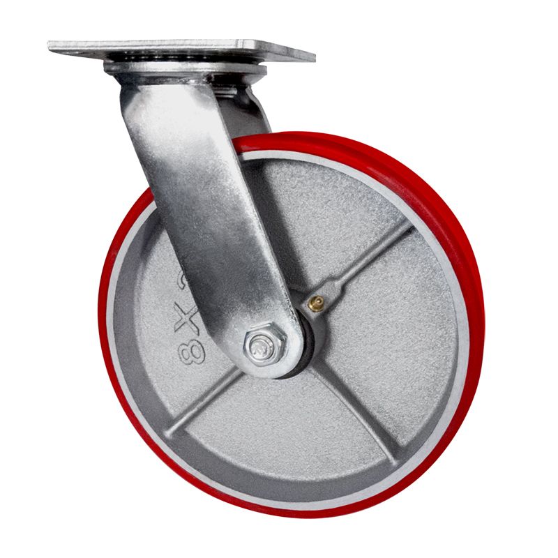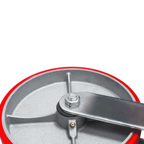 Колесо большегрузное полиуретановое поворотное SCP42 предназначено для оснащения складского, транспортного строительного оборудования и тяжелых механизмов. Шинка выполнена из полиуретана. Материал отличается высокой износостойкостью и большой грузоподъемностью. Колесо отлично переносит динамические, статические и ударные нагрузки, хорошо служит на любых твердых поверхностях. Обод выполнен из чугуна, оснащен роликовым подшипником в оси и смазочным ниппелем. В поворотном механизме установлен двухрядный шариковый подшипник с пресс-масленкой. Кронштейн — сварной, изготовлен из оцинкованной листовой стали. Диапазон температур — от -35ºC до +50ºC.