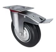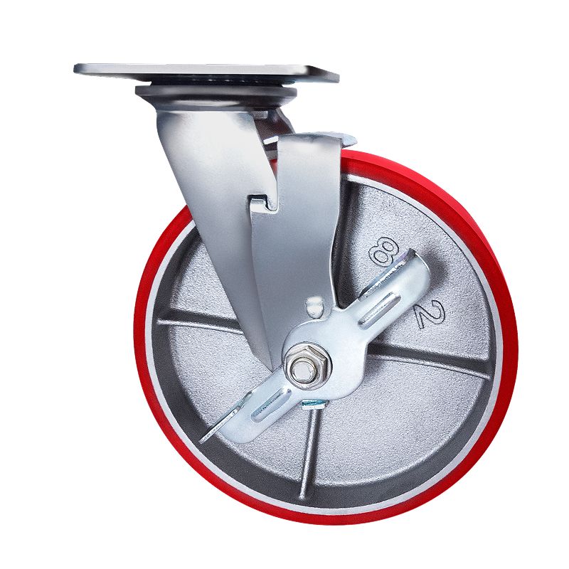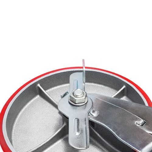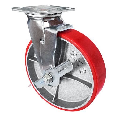 Колесо большегрузное полиуретановое поворотное с тормозом SCPB42 предназначено для оснащения складского, транспортного строительного оборудования и тяжелых механизмов. Шинка выполнена из полиуретана. Материал отличается высокой износостойкостью и большой грузоподъемностью. Колесо отлично переносит динамические, статические и ударные нагрузки, хорошо служит на любых твердых поверхностях. Обод выполнен из чугуна, оснащен роликовым подшипником в оси и смазочным ниппелем. В поворотном механизме установлен двухрядный шариковый подшипник с пресс-масленкой. Кронштейн — сварной, изготовлен из оцинкованной листовой стали. Диапазон температур — от -35ºC до +50ºC.
