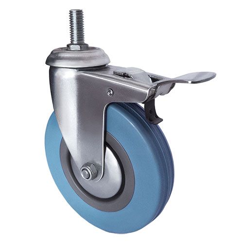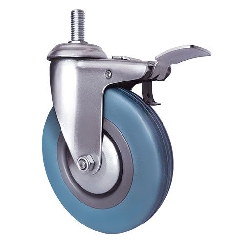 Колесо аппаратное поворотное с болтом и тормозом SCtgb 42 предназначено для легкого торгового, лабораторного, медицинского, гостиничного, офисного и складского оборудования. Шинка выполнена из термопластичной серой резины. В оси установлен подшипник скольжения. Кронштейн с болтовым креплением изготовлен из оцинкованной стали. Полипропиленовый обод закрыт стальными кожухами. Не оставляет следов на напольных покрытиях. Отличается хорошими ходовыми качествами, повышенной маневренностью, низким уровнем шума, устойчивостью к внешним химическим воздействиям. Диапазон температур — от -35ºC до +60ºC.