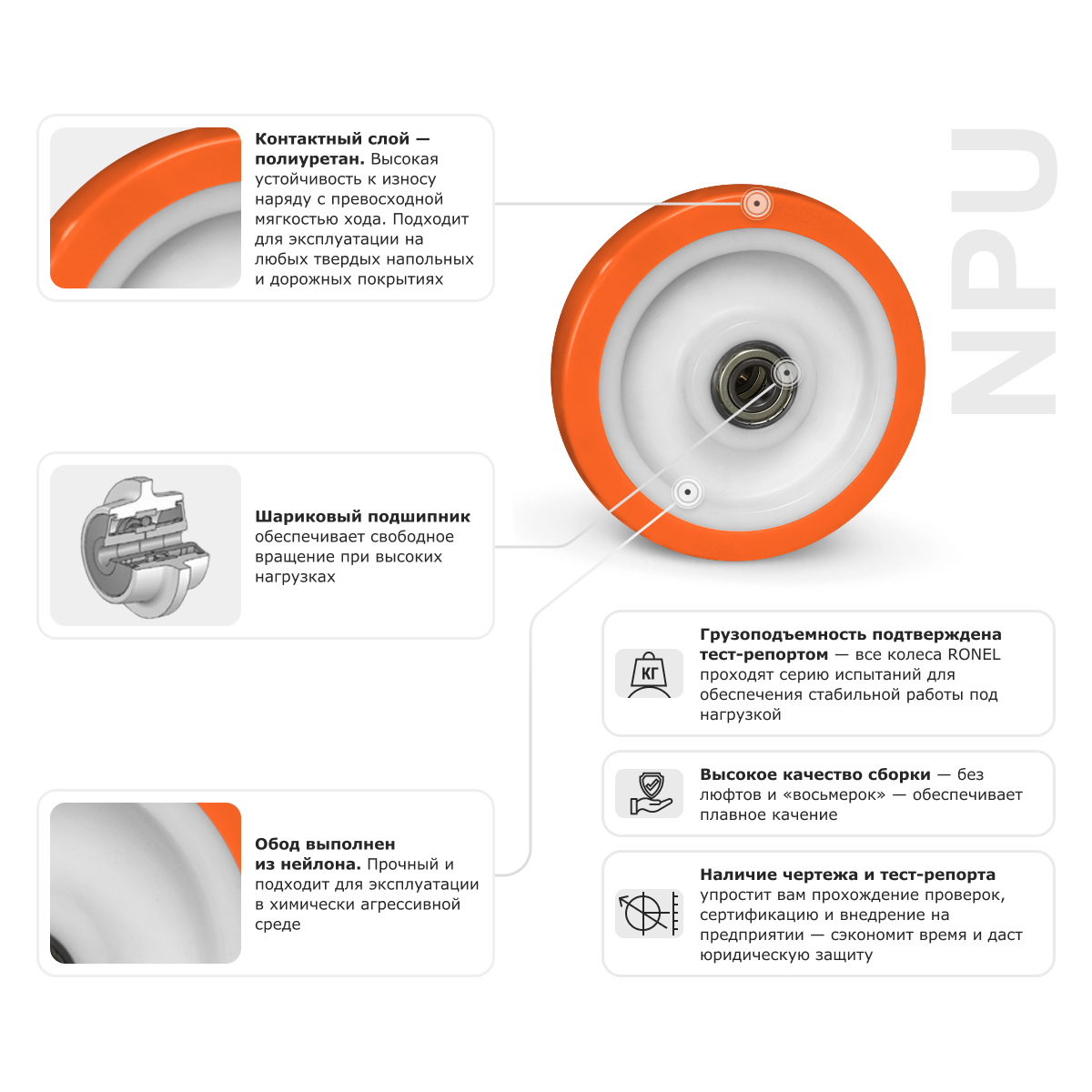 RONEL NPU 100 — это большегрузное колесо, предназначенное для эксплуатации в тяжелых условиях. Его обод выполнен из белого полиамида (нейлона) повышенной прочности, что обеспечивает колесу стабильность формы и высокую жесткость. Контактный слой из устойчивого к износу полиуретана гарантирует отличное сцепление с разными поверхностями и демонстрирует отличную сопротивляемость порезам и абразивному истиранию. В ступице — шариковый подшипник, обеспечивающий плавность хода.