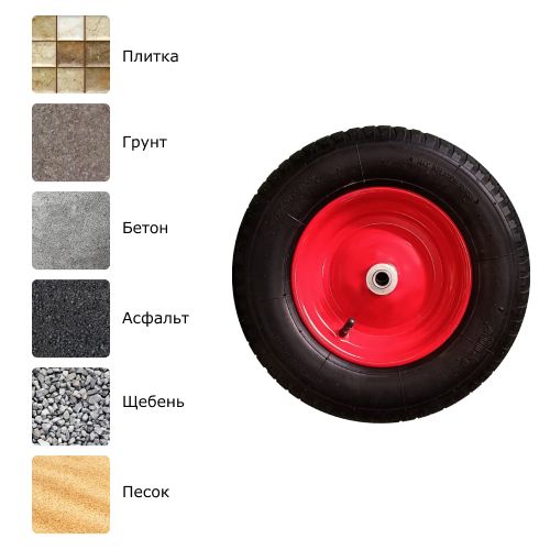 Грузоподъемность данного пневматического колеса составляет 210 кг, диаметр — 390 мм. Модель отличается высокой проходимостью, может использоваться на рыхлых неровных поверхностях (песок, щебень и т. п.), подходит для строительных и садовых тачек.